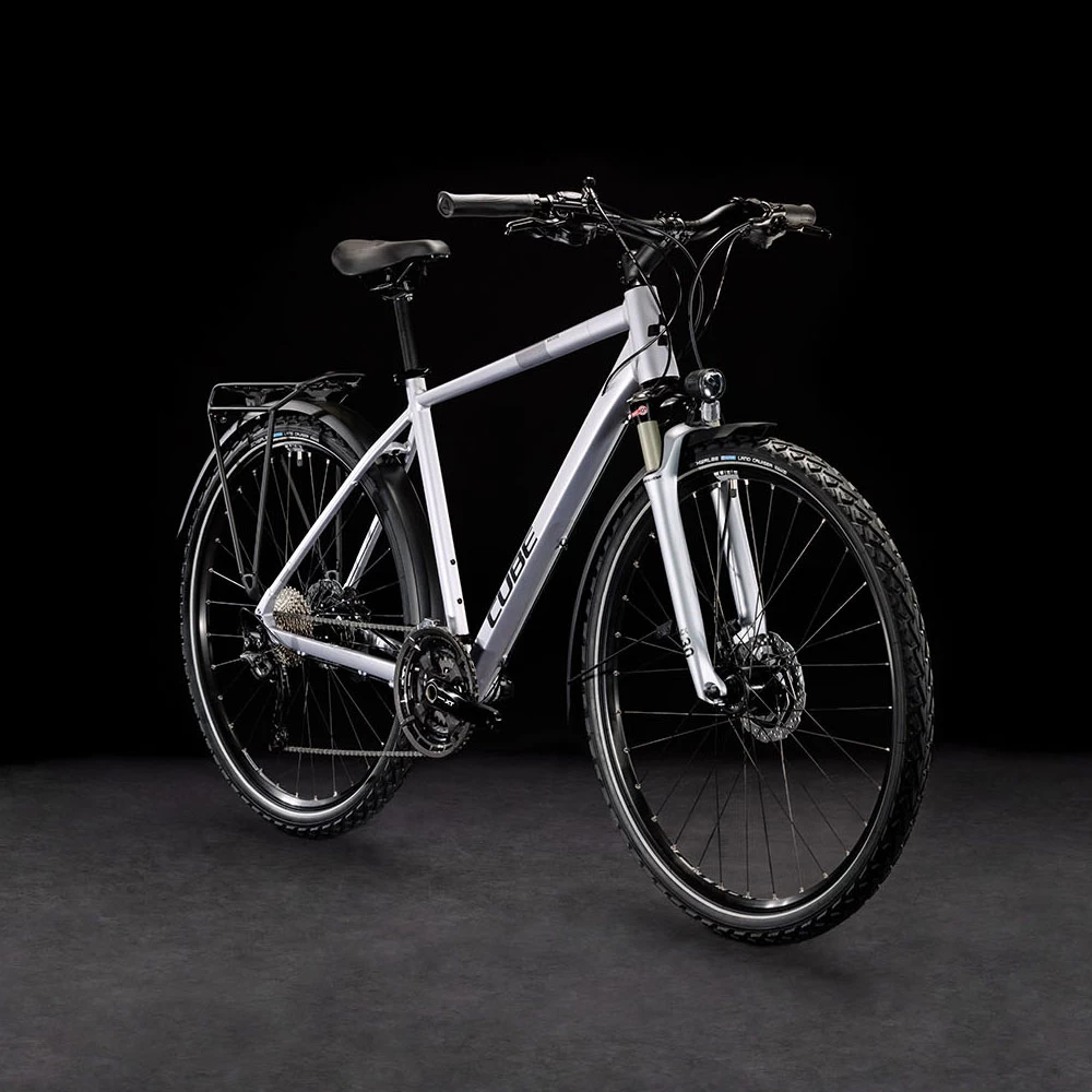Whether you fancy exploring off the beaten track or need a way to get around town, the CUBE Nature EXC will help you get to where you’re going. The comfortable, easy-to-adjust Suntour air suspension fork is just what’s needed to smooth potholed road surfaces, while wide-ranging Shimano 3×10-speed gears and powerful hydraulic disc brakes put you in full control. And the sturdy luggage carrier, mudguards, handy kickstand and built-in lighting system mean you’re ready for anything.