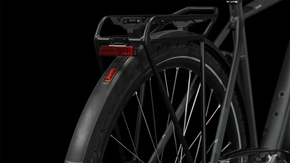A suspension fork and suspension seatpost help smooth out rough roads. And full-length mudguards, a neatly integrated luggage carrier, built-in dynamo lights and a handy kickstand mean you’ve everything you need for short trips across town and longer forays into the countryside.